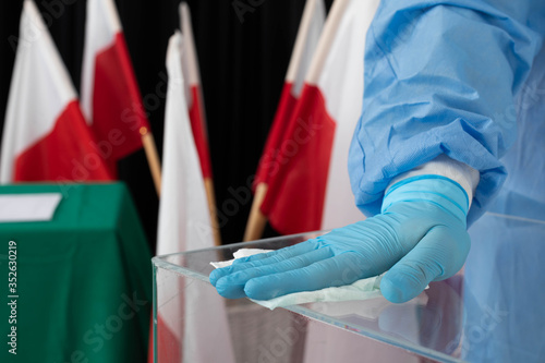 The employee during disinfection tries to thoroughly clean every inch of the ballot box to avoid infection.