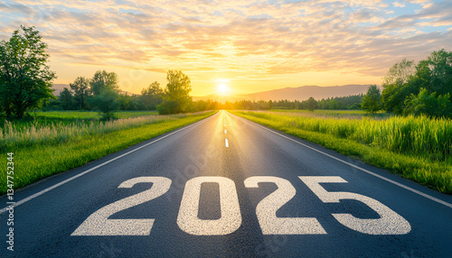 The end of an empty road path and the start of a new year in 2025. New goals for 2025 and leaving behind 2024. Passing. New goals for 2025 and leaving
