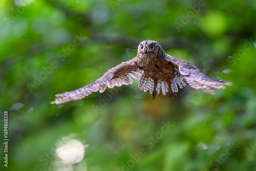 The Eurasian Scops Owl is landing on a branch in the forest.