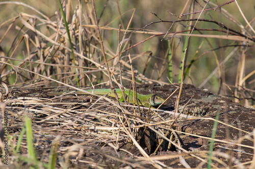 The European green lizard (Lacerta viridis) is a large lizard distributed across European midlatitudes from Slovenia and eastern Austria to as far east as the Black Sea coasts of Ukraine and Turkey.