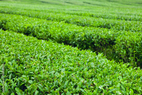 The finest green tea bushes at the organic green-tea plantation of Jeju Island, South Korea