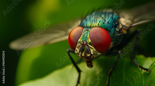 The flies' red eyes are very clear in this close-up photo. The background is a blurry green, with leaves in the foreground.