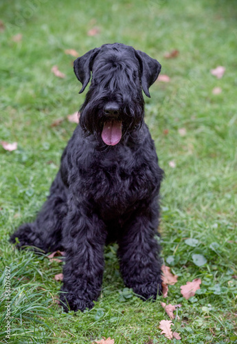 The Giant Schnauzer breed dog Sitting on the grass. Portrait. Also known as Riesenschnauzer.
