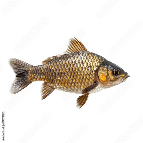 The golden crucian carp with shiny scales and expressive fins is depicted on a transparent background.