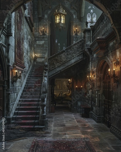 The Gothic charm within a castle's interior spaces, dim lighting, and detailed stone carvings create an atmosphere of historical intrigue and mystery.