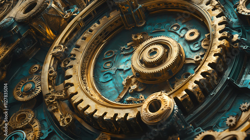 The grand mechanism a steampunk masterpiece, digital art, golden gears, ornate design, fantasy machine, steampunk, machine, gears, art. Verdigris. Illustration