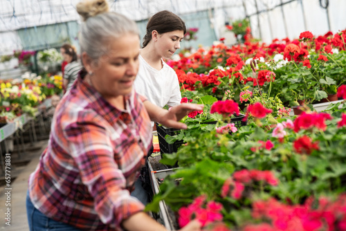 The grandmother and her granddaughter work side by side in their greenhouse garden.