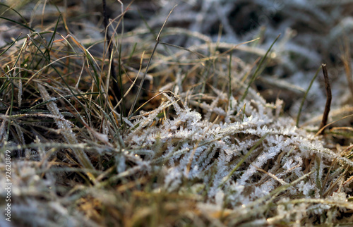 The grass layered with ice crystals in winter time