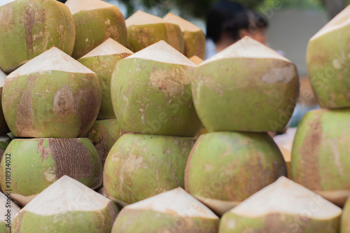 The green coconuts in the shop, shaker, peel the top and stack them in front of the shop. For drinks for health lovers