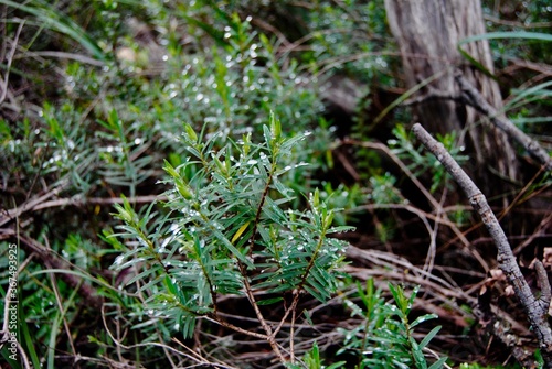 The green grass background and with the dried leaves in the park in the Blue Mountains national parks in Australia
