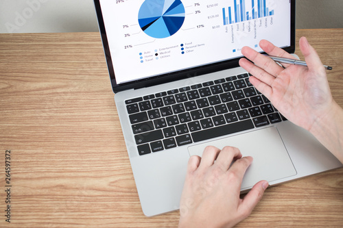 The hands of businessmen are analyzing graphs and data on computer monitors.