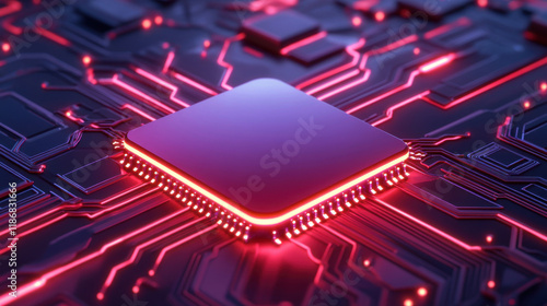 The Heart of Technology: A close-up of a powerful processor chip, illuminated by vibrant red neon light, sits at the center of intricate circuit board, symbolizing the core of modern technology.