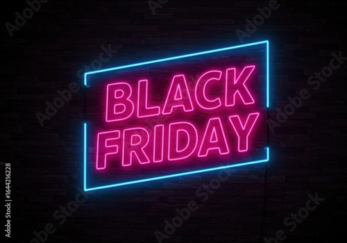 The iconic Black Friday neon sign shines against a dark brick wall, advertising a sale.