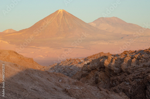 The iconic Licancabur volcano glows with vibrant pink and purple alpenglow at sunset, rising above the otherworldly landscape of the Moon Valley (Valle de la Luna) in the Atacama Desert, Chile.