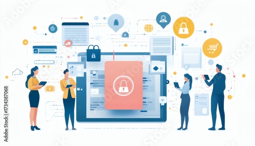 The illustration shows four people using tablets and working together around a large tablet displaying data security icons and information.