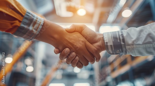 The image captures a solid handshake between workers in an indoor facility, signifying cooperation, partnership, and mutual trust between individuals in a professional setting.