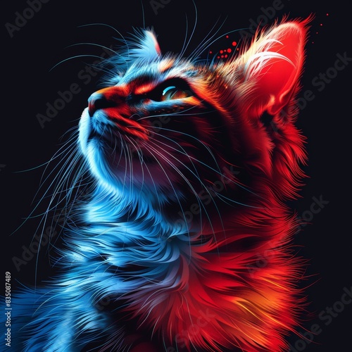 The image depicts a highly stylized and colorful cat. Its fur features vibrant shades of blue, orange, and pink, resembling cosmic gases