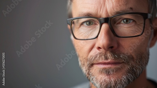 The image depicts a middle-aged man wearing glasses, with a neutral expression.