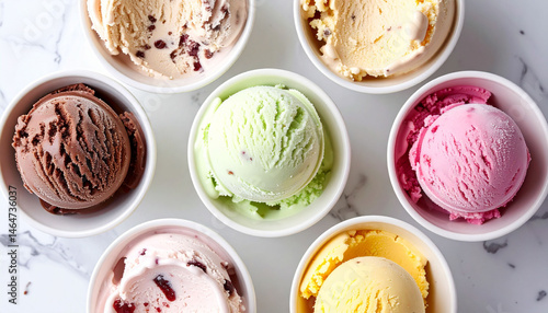 the image features several scoops of dessert arranged in a circular pattern. each scoop is a different color, ranging from light beige to chocolate to bright pink, and is served in a small white bowl