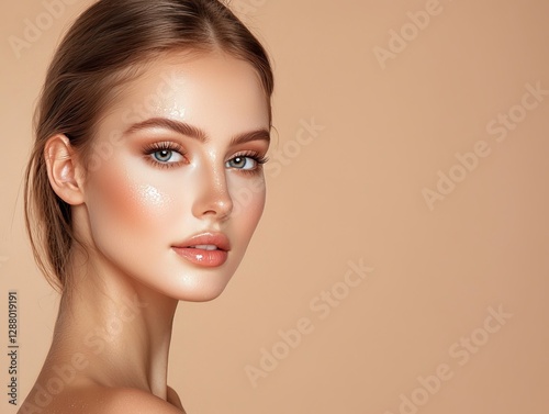 The image is a close-up of a woman's face, showcasing her smooth skin and subtle makeup
