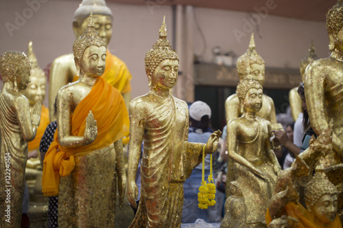 The image of a golden Buddha statue with gold leaf pasting multiple elements.