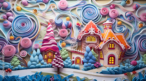 The image of creative paper cutting artwork with a candy land theme in Christmas scenery, background or backdrop for Christmas card and greeting reference.