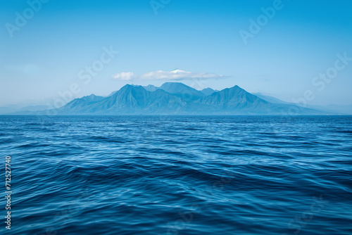 The image shows a mountain range in the middle of the ocean. The mountains are tall and jagged, and they rise from the deep blue water.