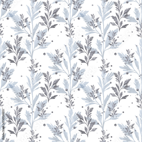 The image shows a sophisticated seamless pattern of gray watercolor branches on a white background. The soft leaves are made with delicate tonal transitions, which creates an effect of depth and tranq