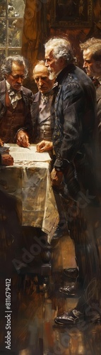 The image shows three men in a room, two of whom are drinking wine.