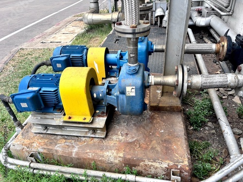 The image shows two industrial pumps with blue motors and yellow covers, connected to a network of metallic pipes. They are mounted on a rusty concrete base next to a road, surrounded by weeds.