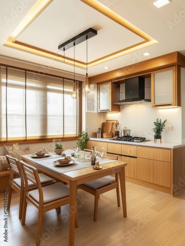 The interior image depicts a modern kitchen with furniture in wood