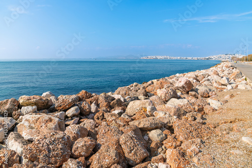 The long seaside pedestrian promenade along the Athenian Riviera Flisvos Marina park at Palaio Faliro, Greece, with the city of Piraeus in view in the distance.