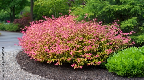 The lush Euonymus shrub stands elegantly in the garden, its rich leaves enhancing the charm of the surrounding landscape design.