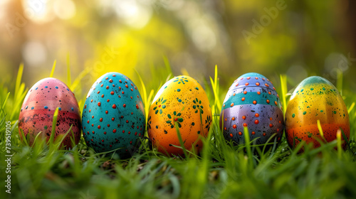 The magic of Easter with colorful eggs nestled in the grass on a sunny spring day