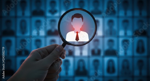 The magnifying glass focuses on one face among many, highlighting the selection of the best specialists