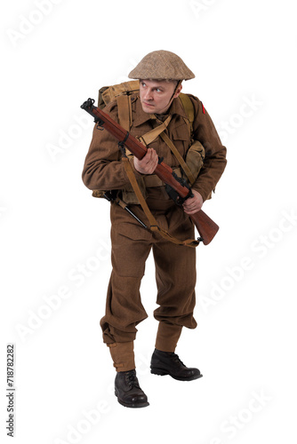 The man is an actor in vintage military uniform of the American soldier, period World War I, 1914-1918