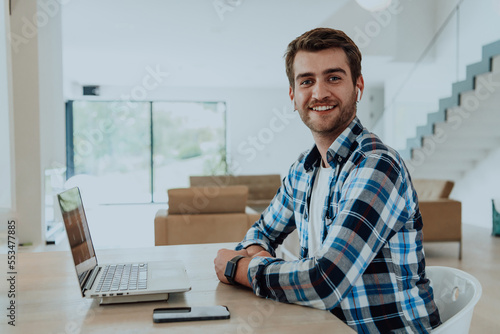 The man sitting at a table in a modern living room, with headphones using a laptop for business video chat, conversation with friends and entertainment