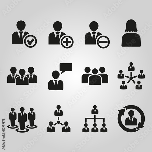 The management icon, set of 12 icons. Team and group, teamwork, people, alliance symbol. UI. Web. Logo. Sign. Flat design. App.