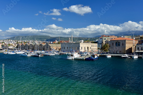 The marina and venetian shipyards in the old harbour of Chania, Crete Island, Greece, Europe