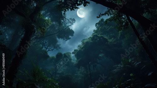 The moon illuminating a dense forest canopy,