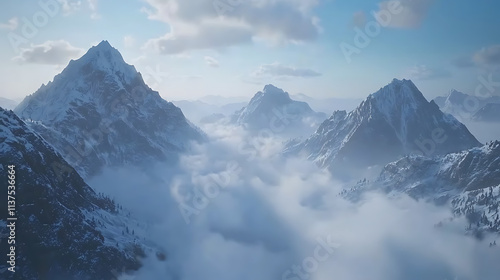 The mountains are covered in snow and the sky is cloudy