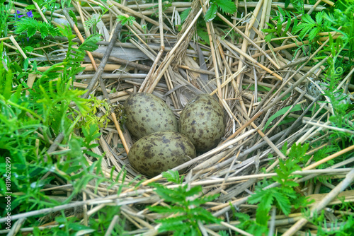 The nest of the common gull (Larus canus) on the sea meadow of the island in the eastern part of the Gulf of Finland. A mixed land colony of gulls and terns
