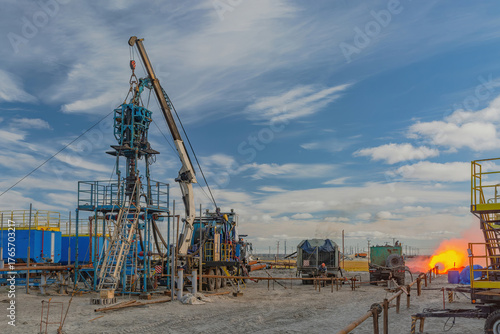 The Northern gas field. Summer. Installation for lowering a flexible pipe into a well. Equipment for testing and development of a gas well