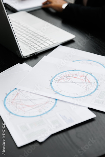 The notepad for writing down ideas and the astrological natal birth chart lie on a black background. A computer keyboard and mouse next to it and a phone. Astrological consultation idea.