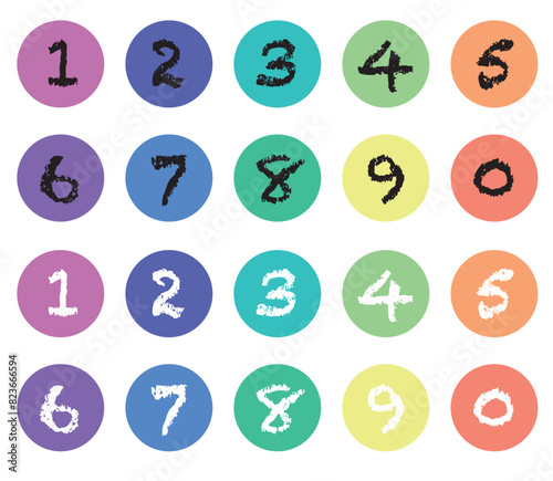 The numbers are in coloured circles. From 0 to 9. Filled points info markers. Black and white numbers on colour background.