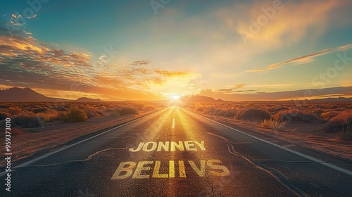 The Open Road Through a Desert at Sunset with "JOURNEY BEGINS" Written Across the Path: Symbolizing New Adventures and the Start of a Quest
