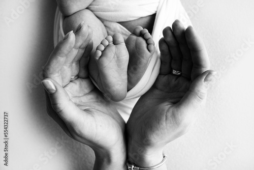 The palms of the father, the mother are holding the foot of the newborn baby.