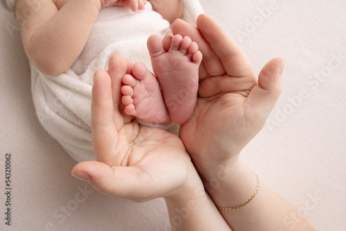 The palms of the parents. A father and mother hold the feet of a newborn child in a white blanket on a white background.. The feet of a newborn in the hands of parents. Photo of foot, heels and toes.