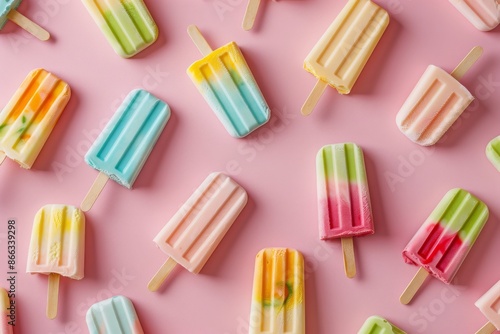 The pattern is made of colourful ice cream bars, ice lollies, and popsicles on a pastel pink color background. Trendy summer concept with frozen ice pops. rainbow lollies. Flat lay, summer background