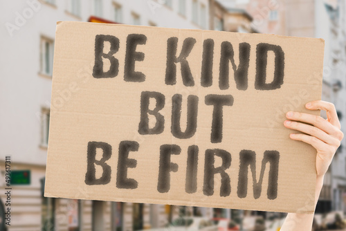 The phrase " Be kind but be firm " on a banner in men's hands with blurred background. Identity. Powerful. Professional. Working. Reaction. Strength. Courageous. Vitality. Force. Arrogant. Employee